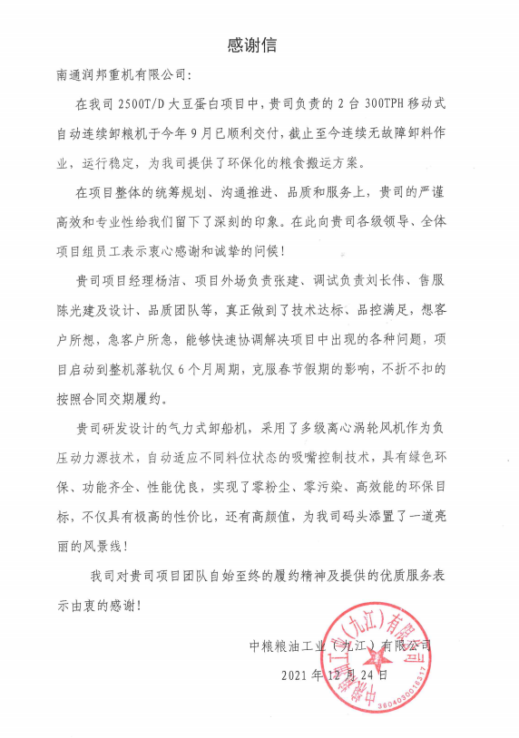 “在我司2500T/D大豆蛋白項目中,貴司負責的2臺300TPH移動式自動連續卸船機于今年9月已順利交付,截止至今連續無故障卸料作業,運行穩定,為我司提供了環保化的糧食搬運方案......我公司對潤邦重機項目團隊自始至終的履約精神及提供的優質服務表示由衷感謝?!敝屑Z糧油工業(九江)有限公司在寄來的感謝信中寫道。