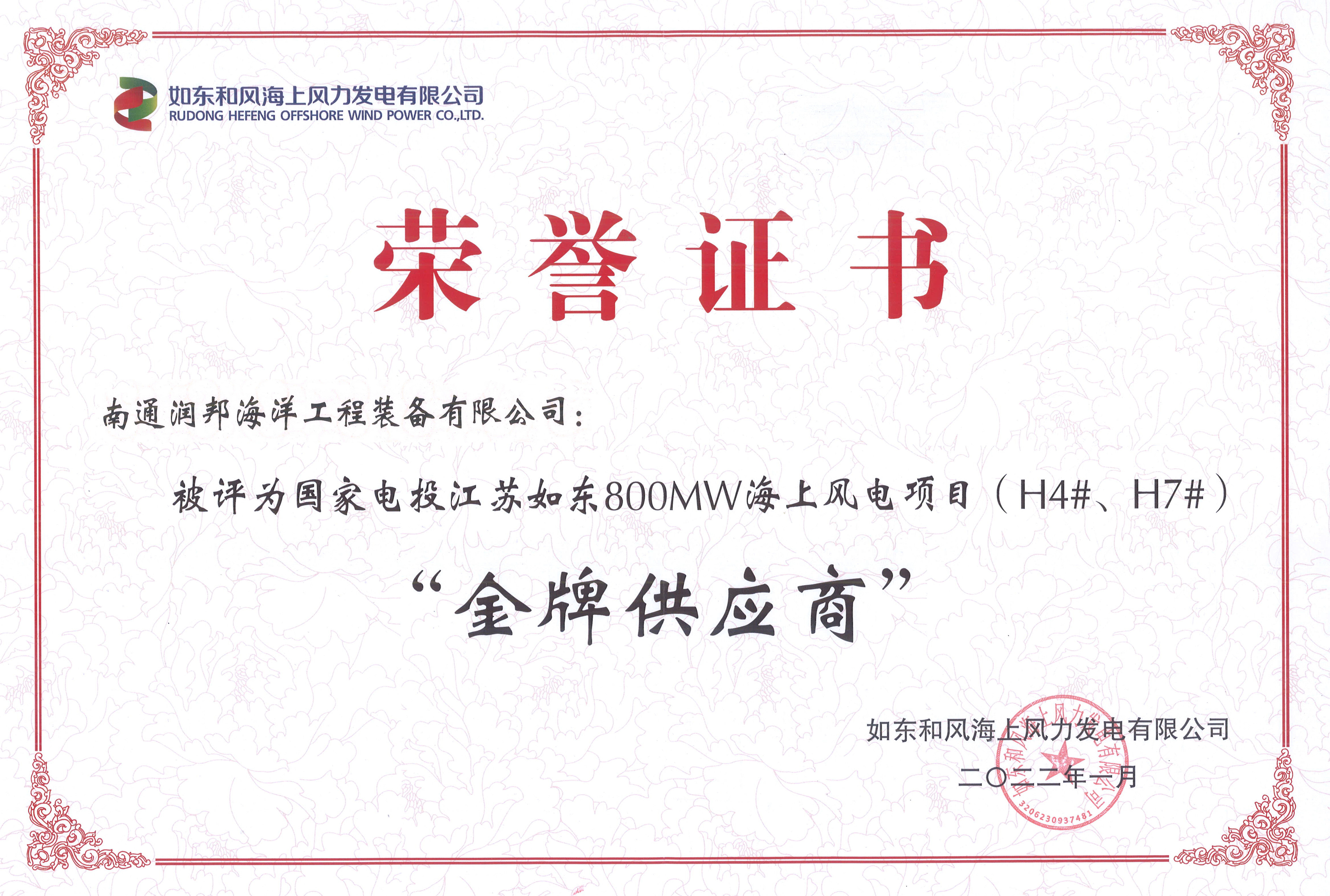 近日,潤邦海洋再獲殊榮,被評為國家電投江蘇如東800MW海上風(fēng)電項目(H4#、H7#)“金牌供應(yīng)商”。金牌供應(yīng)商是國家電投集團(tuán)對供應(yīng)商的最高評價,是對潤邦海洋綜合整體實力的認(rèn)可,更是對潤邦海洋項目團(tuán)隊為項目努力付出的肯定。