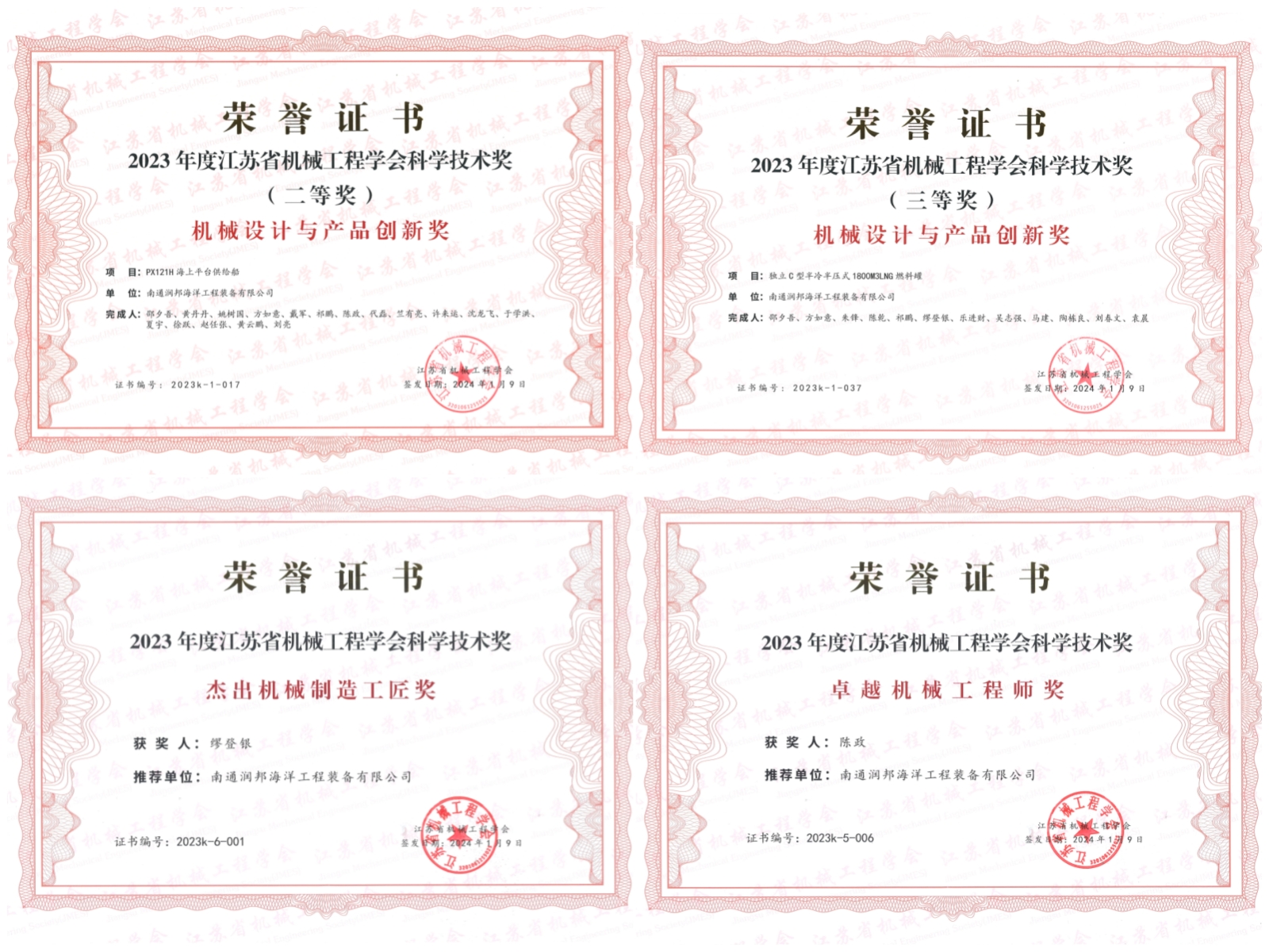 子公司潤邦海洋榮獲江蘇省機械工程學會多個獎項