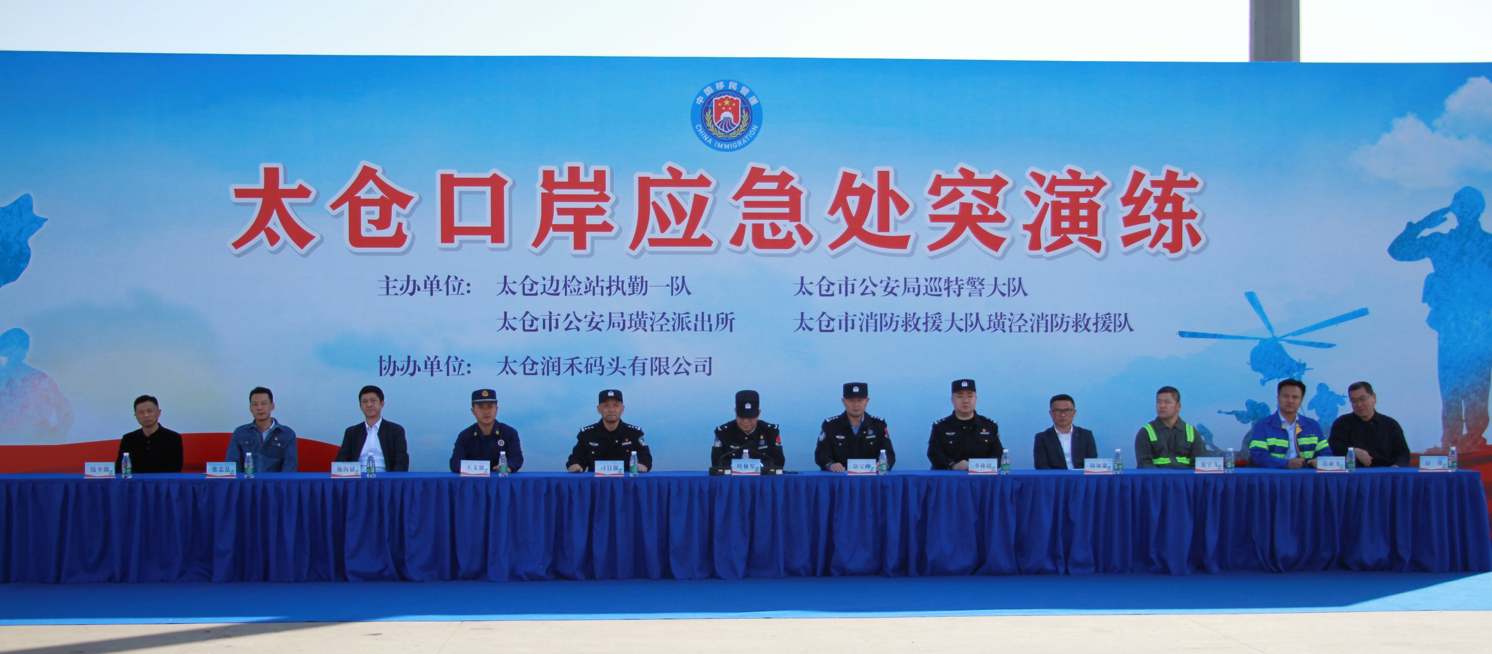 為維護口岸安全穩定,強化協作聯動機制,近日,太倉邊檢站聯合駐地公安、消防和120急救中心在潤禾碼頭開展口岸聯合反恐應急處突演練。太倉邊檢站站長葉林軍、副站長徐寶峰、相關單位負責人、潤禾碼頭總經理胡加寬現場觀摩了此次演練活動。