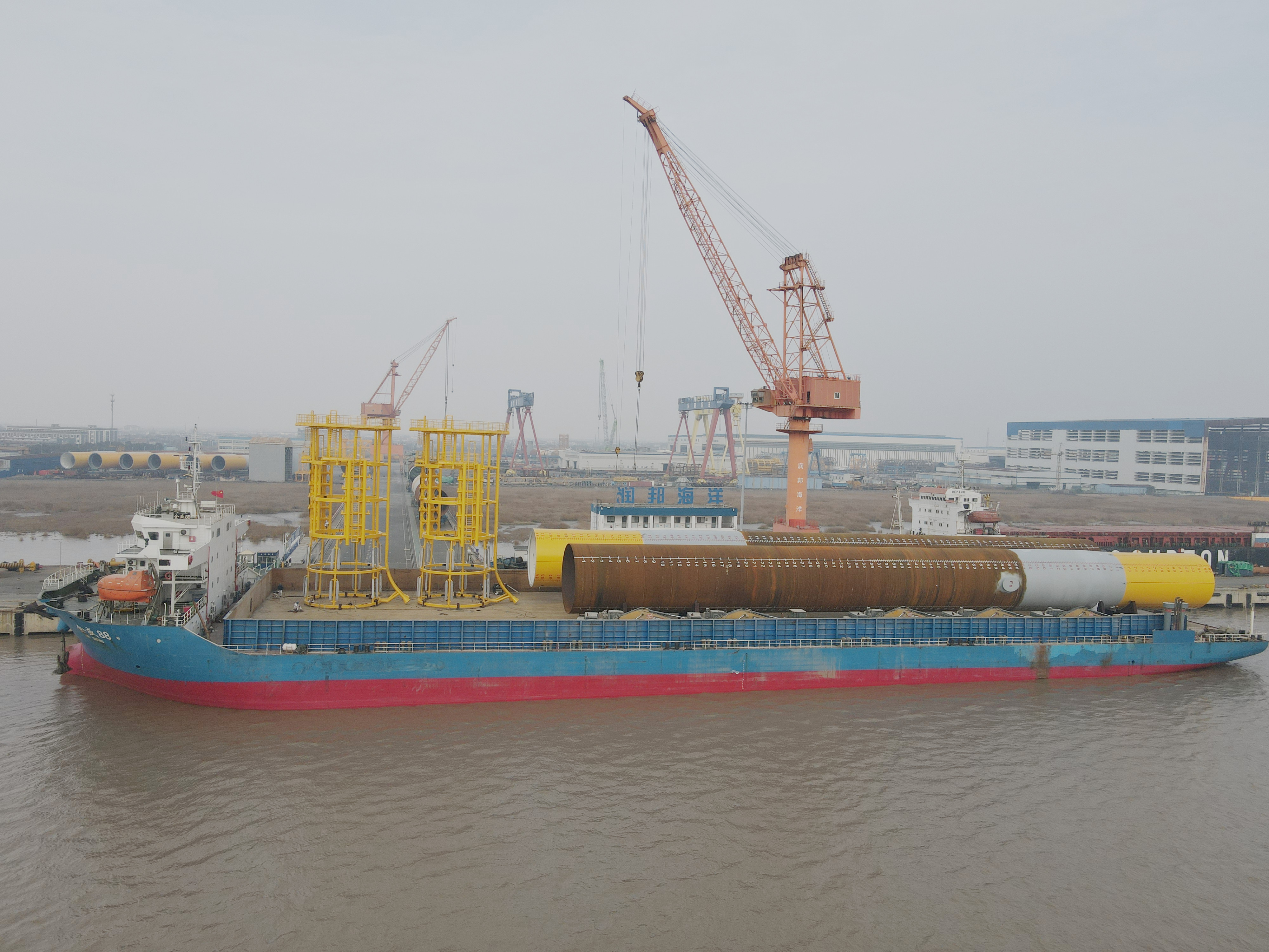 In this instance, Rainbow Offshore undertook the construction tasks of offshore wind power foundation piles and substation jacket for the Tianjin Nangang Offshore Wind Power Demonstration Project. The diameter of the offshore wind power foundation piles ranges from 7.5 to 8 meters, with a weight between 1,200 and 1,300 tons. The substation jacket mainly consists of an upper block and a lower structure, with the upper block adopting a frame-bracing system and the lower structure using a jacket nested pile foundation form. After the upper and lower structures are connected, they form a multi-layered spatial integral truss, which has good rigidity and is more conducive to horizontal load action, enhancing the overall stability of the structure.