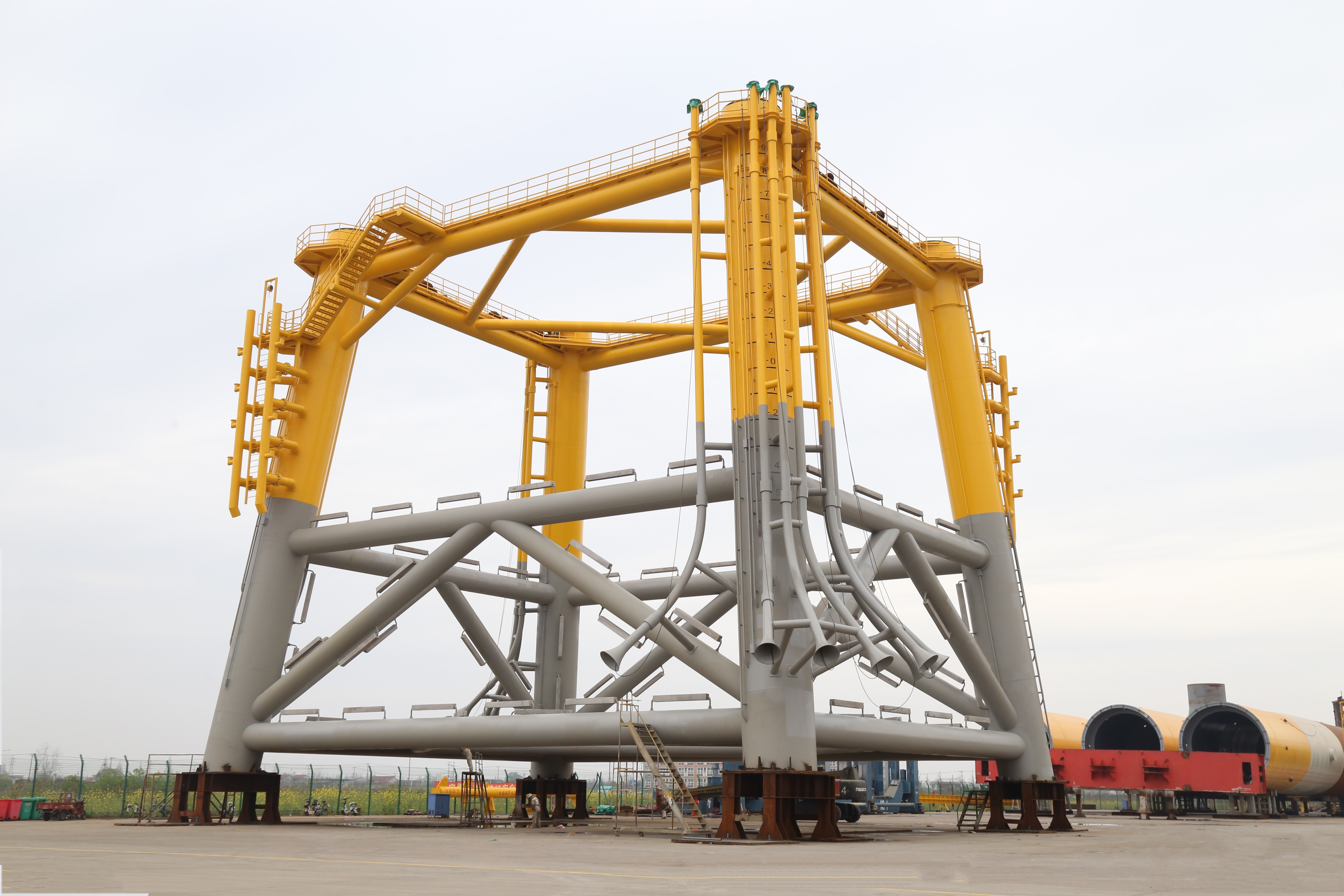 此次潤(rùn)邦海洋承接天津南港海上風(fēng)電示范項(xiàng)目海上風(fēng)電基礎(chǔ)樁和海上升壓站導(dǎo)管架的建造任務(wù),海上風(fēng)電基礎(chǔ)樁直徑在7.5—8米,重量在1,200—1,300噸。海上升壓站導(dǎo)管架主要包括上部組塊和下部結(jié)構(gòu),上部組塊結(jié)構(gòu)采用框架-支撐體系,下部結(jié)構(gòu)采用導(dǎo)管架嵌套樁基礎(chǔ)型式。上下部結(jié)構(gòu)連接后形成多層空間整體桁架,有良好的剛度,更有利于水平荷載作用,增加結(jié)構(gòu)整體穩(wěn)定性。
