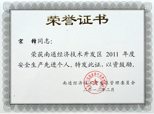 公司被評(píng)為“南通市2011年度安全生產(chǎn)目標(biāo)管理先進(jìn)集體”