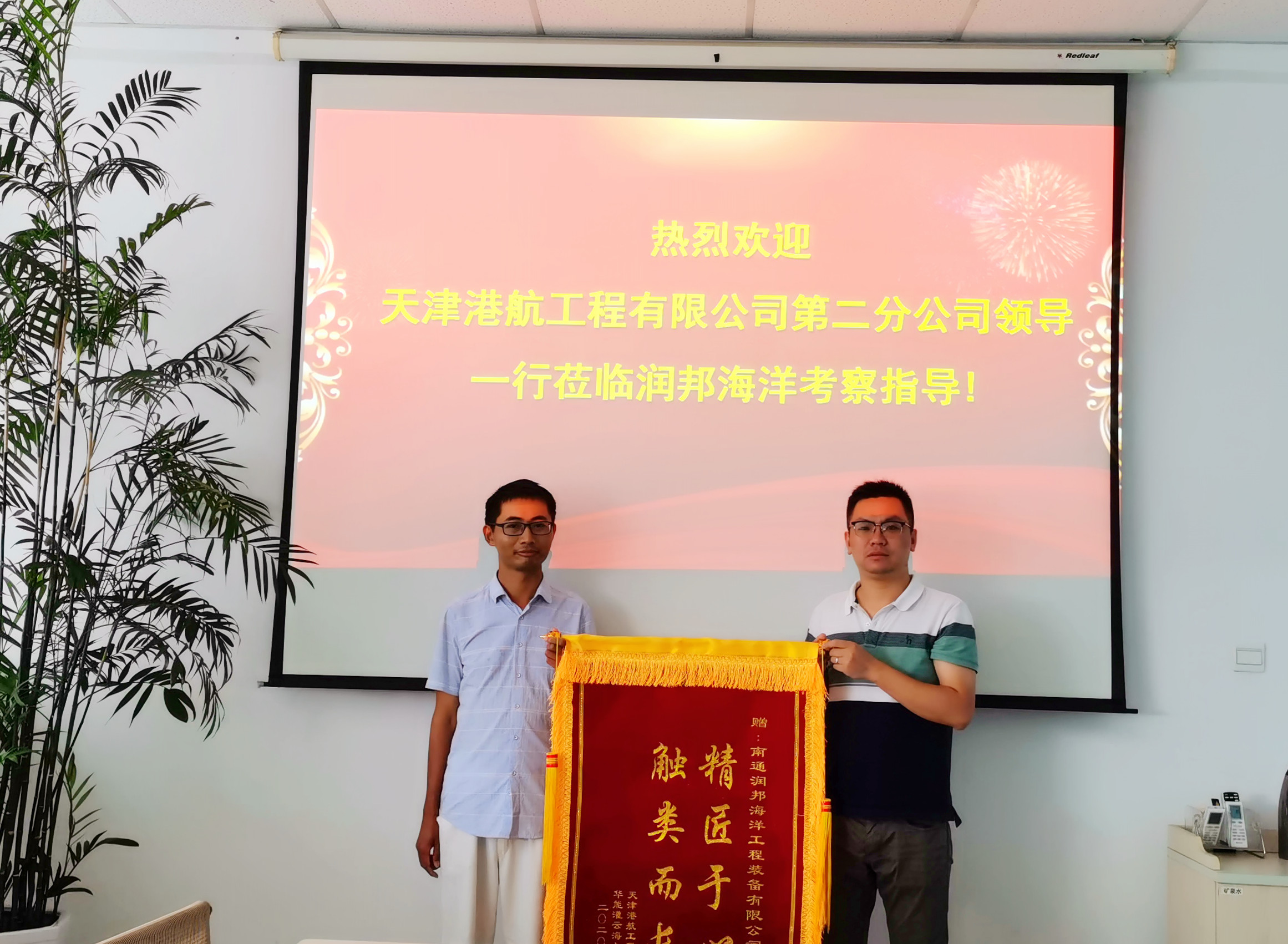 2020年9月16日,天津港航工程有限公司第二分公司領導蒞臨潤邦海洋,為答謝潤邦海洋在雙方合作海上風電項目上的突出表現,將“精匠于心、觸類而長”的榮譽錦旗送到公司副總經理方如意先生手中。公司領導熱情接待了天津港航客人,公司與天津港航通過多年的合作,雙方建立了友好的戰略伙伴關系。
