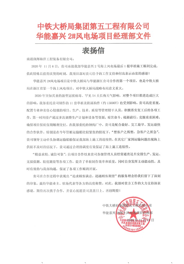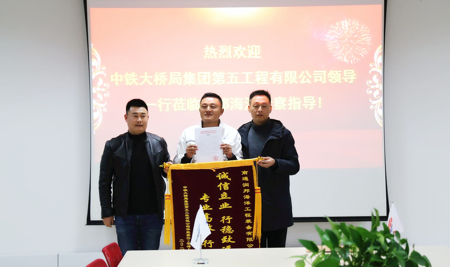 近日,中鐵大橋局集團第五工程有限公司領導蒞臨潤邦海洋,特意送來“誠信立業、行穩致遠;專業高效、行業龍頭”的榮譽錦旗及感謝信,高度稱贊潤邦海洋在雙方合作的“華能嘉興2#風電場項目”上表現出的頑強拼搏、精益制造的生產服務理念。潤邦海洋常務副總經理邵夕吾等熱情接待了中鐵大橋局集團的客人。