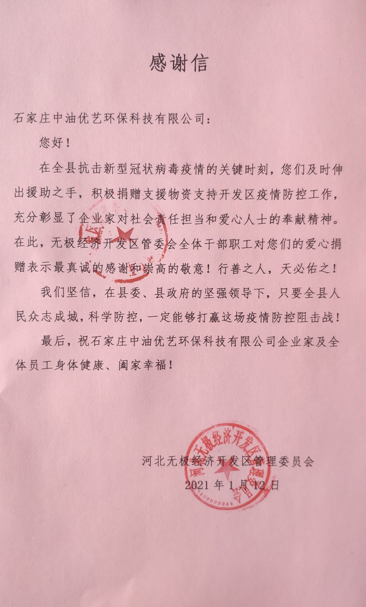 疾風知勁草,危難顯擔當。在奮力抗疫的關鍵時期,石家莊公司總經理李杰及總經理助理康軍超等一行人為無極縣經濟開發區管理委員會送去了抗疫救援物資,用實際行動展現了攜手同行眾志成城的大愛精神。公司的愛心行為也得到了無極縣管理委員會的高度肯定并發來表揚信。二月紺香,三月桃良,沒有一個春天不會來臨,相信我們必將打贏這場疫情防控阻擊戰。