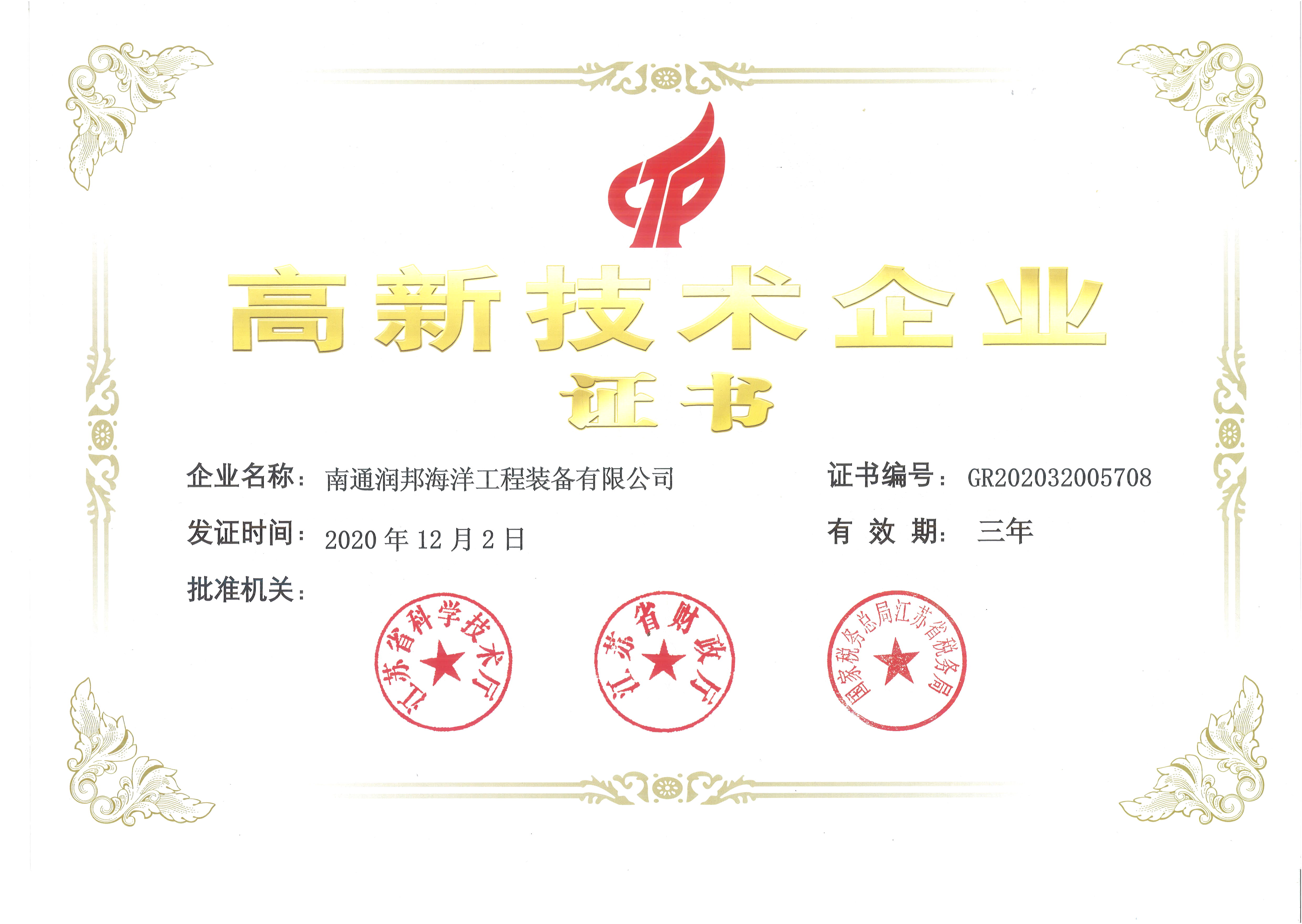 近日,潤(rùn)邦海洋獲江蘇省科學(xué)技術(shù)廳、江蘇省財(cái)政廳、國(guó)家稅務(wù)總局江蘇省稅務(wù)局聯(lián)合頒發(fā)的《高新技術(shù)企業(yè)證書(shū)》,這意味著公司正式通過(guò)了高新技術(shù)企業(yè)的認(rèn)定。
