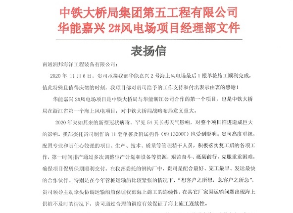 中鐵大橋局集團(tuán)第五工程有限公司領(lǐng)導(dǎo)蒞臨潤邦海洋,特意送來“誠信立業(yè)、行穩(wěn)致遠(yuǎn);專業(yè)高效、行業(yè)龍頭”的榮譽(yù)錦旗及感謝信,高度稱贊潤邦海洋在雙方合作的“華能嘉興2#風(fēng)電場(chǎng)項(xiàng)目”上表現(xiàn)出的頑強(qiáng)拼搏、精益制造的生產(chǎn)服務(wù)理念。公司常...