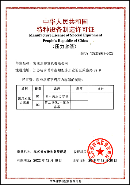 近日,經江蘇省特種設備安全監督檢驗研究院現場審核和南通市市場監督管理局特設科現場監督,潤邦重機順利通過了壓力容器D1、D2特種設備制造許可認證,進一步證明了公司在技術、生產、資源等方面制度體系健全完善,基礎管理規范有序。
