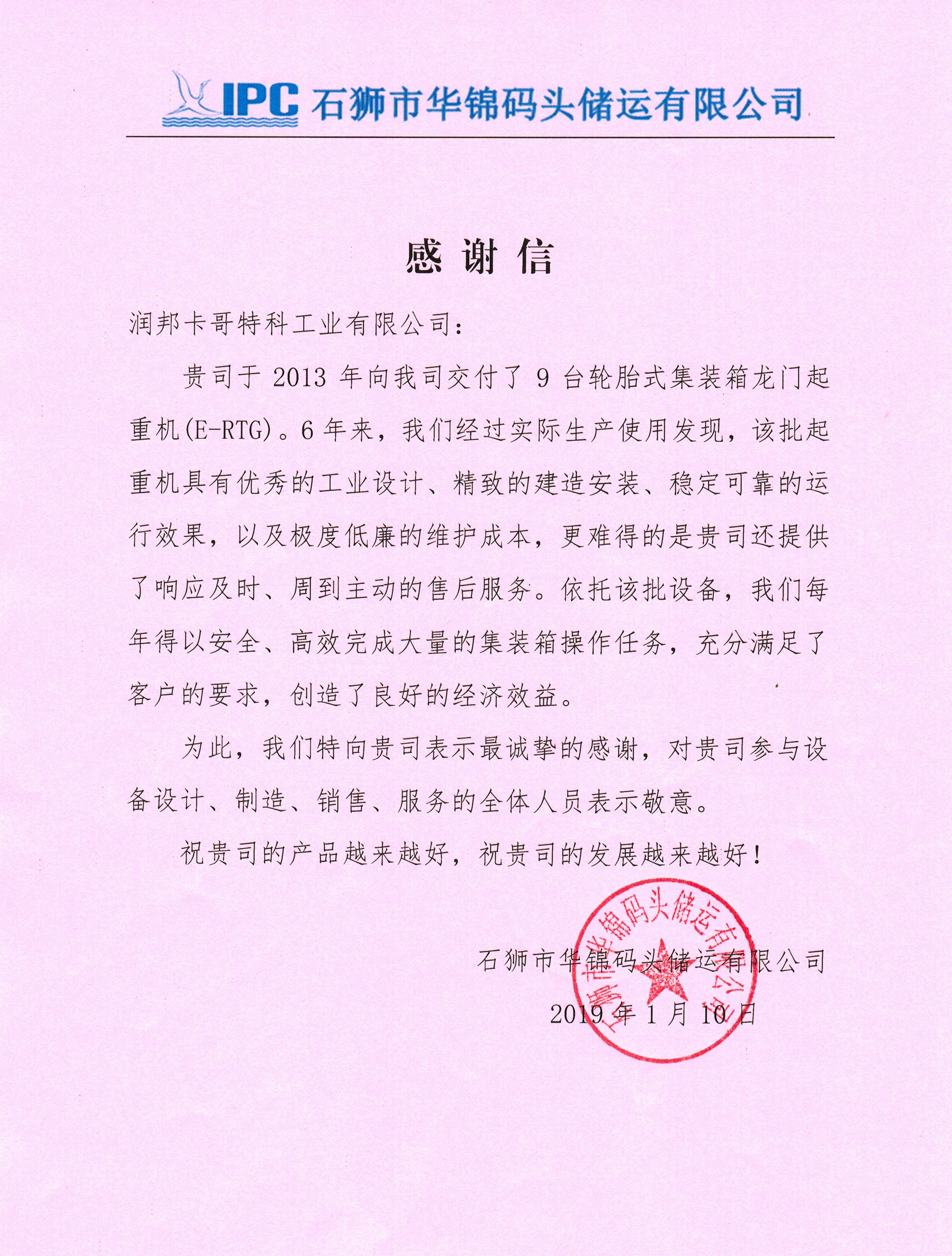 近日,潤邦卡哥特科收到石獅市華錦碼頭儲運有限公司發來的感謝信。信中對潤邦卡哥特科承建的9臺輪胎式龍門起重機的設計、性能、運行效果表示大力認可及高度贊揚。信中提到,6年來,經過實際生產使用發現,我司制造的起重機具有優秀的工業...