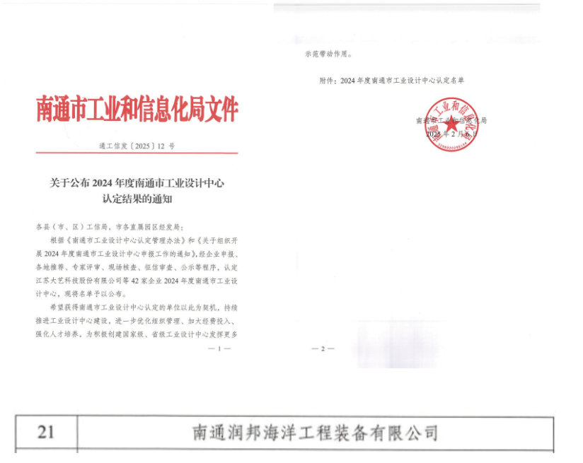 近日,南通市工業和信息化局公布2024年度南通市工業設計中心認定結果的名單,子公司潤邦海洋經過專家評審、現場核查、征信審查等程序,最終被認定為2024年度南通市工業設計中心。此次設計中心的認定是對潤邦海洋創新能力、設計水平及服務...