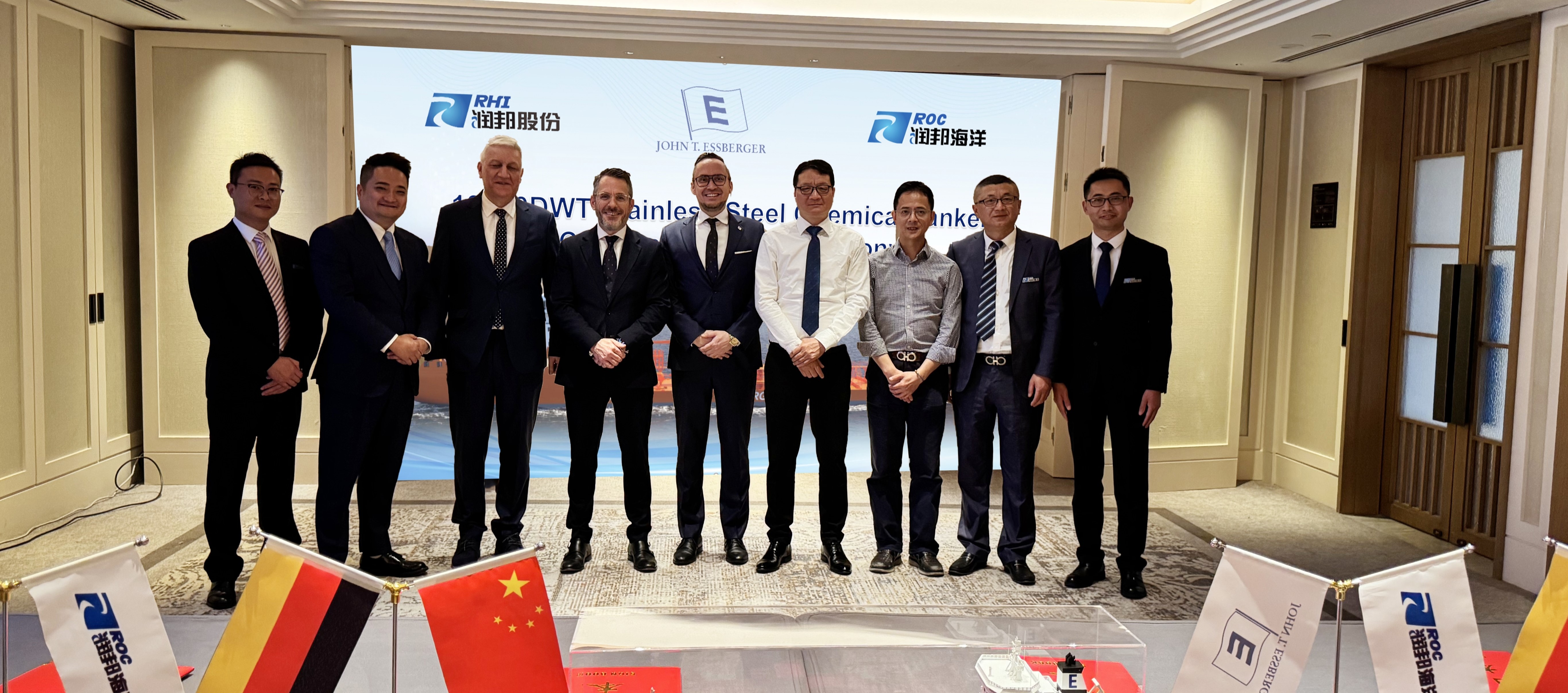 繼去年簽署2艘13,000載重噸雙向不銹鋼化學品船后,近日,子公司潤邦海洋在上海成功舉行了DAL/Essberger集團后續2艘選擇船合同的簽約儀式。本次簽約進一步加強了雙方在不銹鋼化學品船領域的全面合作。