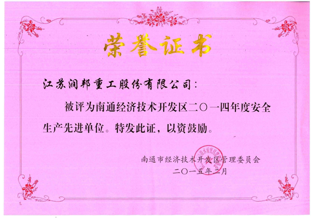 近日,江蘇潤邦重工股份有限公司被南通經(jīng)濟(jì)技術(shù)開發(fā)區(qū)管理委員會評為“二0一四年度安全生產(chǎn)先進(jìn)單位”。