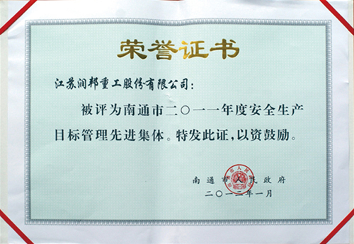 近日,江蘇潤邦重工股份有限公司被南通市人民政府評為“南通市2011年度安全生產目標管理先進集體”。同時,公司安全環境部部長宋鋒先生獲得了由南通開發區管委會授予的“南通經濟技術開發區2011年度安全生產先進個人”稱號。