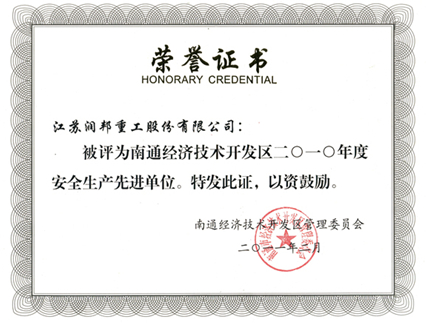 近日,潤邦股份被評為南通經濟技術開發區2010年度安全生產先進單位。同時,公司安全環境部部長宋鋒同志榮獲南通經濟技術開發區2010年度安全生產先進個人稱號。