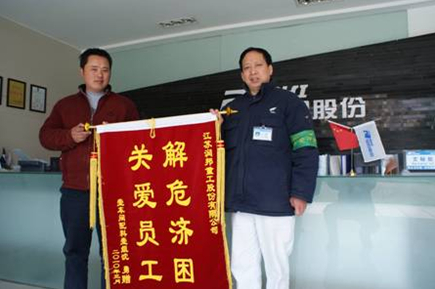 3月29日上午,一車間配料一組員工沈勇將一面寫有“解危濟(jì)困 關(guān)愛員工”的錦旗送到工會(huì)主席陳南山手中,今年2月6日公司員工迎新晚會(huì)中,公司常務(wù)副總經(jīng)理孫建成、工會(huì)主席陳南山發(fā)動(dòng)公司全體員工為身患重病的員工沈勇捐款,幫助沈勇渡過難...