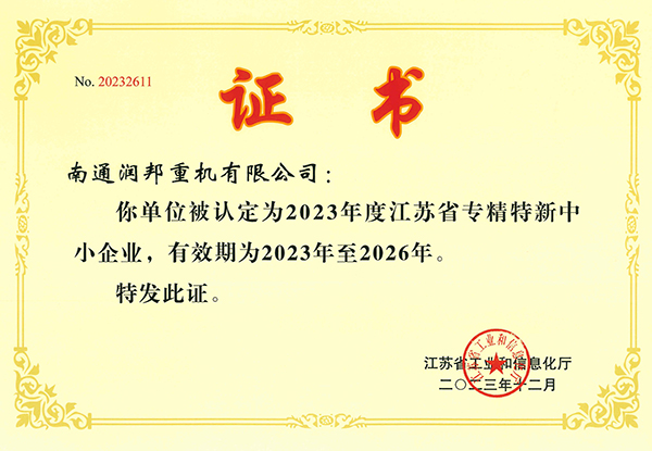 近日,子公司潤邦重機(jī)憑借其在高端裝備領(lǐng)域的專業(yè)表現(xiàn)與持續(xù)創(chuàng)新力,榮獲2023年“江蘇省專精特新中小企業(yè)”認(rèn)定。