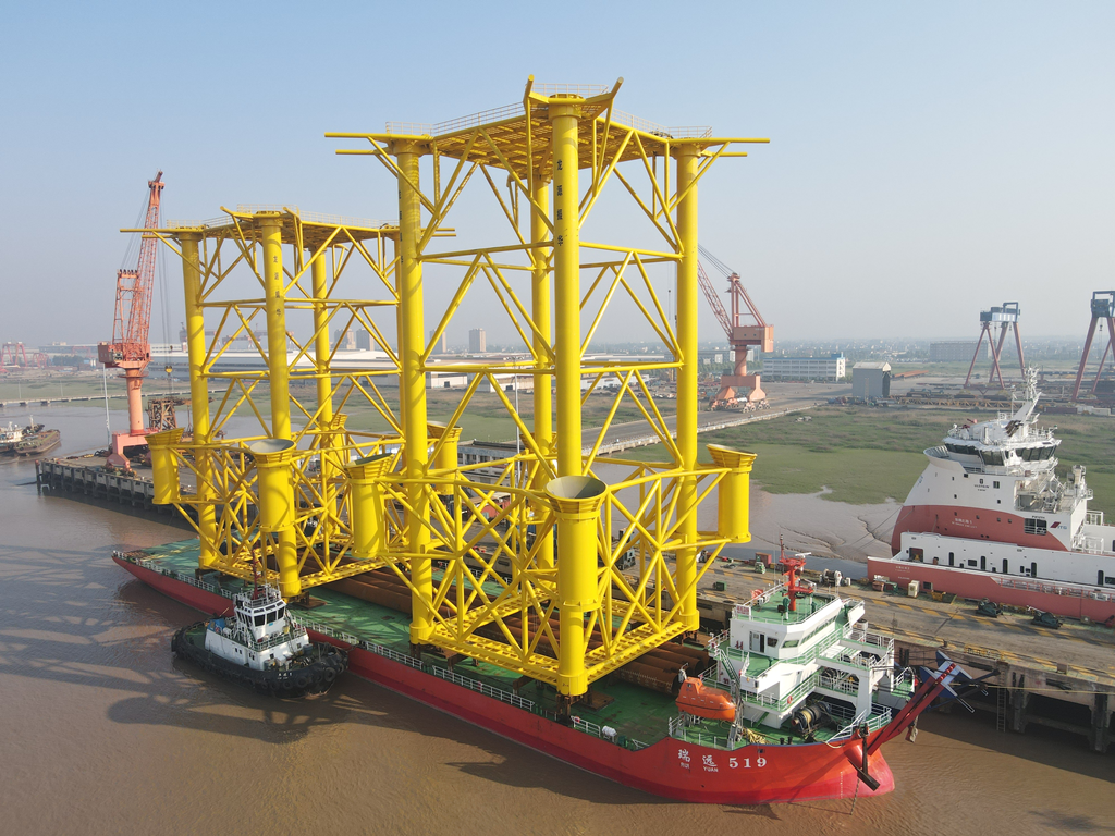 近日,子公司潤邦海洋為客戶建造的廣東青州海上風電項目兩套沉樁導向架完美交付。此次建造的海上沉樁導向架,主要用于導管架定位樁的安裝。導向架重量分別為950噸、975噸,高度分別為51.5米、56.5米,為我公司承接的首例同類產品。