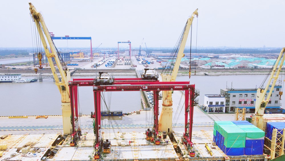 潤邦重機旗下GENMA 品牌1000tph 橋式抓斗卸船機成功落軌客戶碼頭